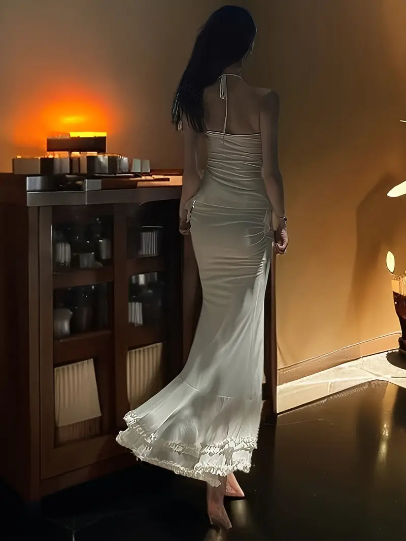 Sexy White Halter Neck Mini Dress with Floral Detail - Perfect for Beach and Summer Parties, Sleeveless, Stretchy Fabric, Floral Embroidery Top, Ruched Waist, and High Slit Skirt, Beach Attire|Floral Embroidery Top|Stretchy Fabric, Beach Dress