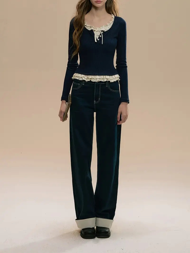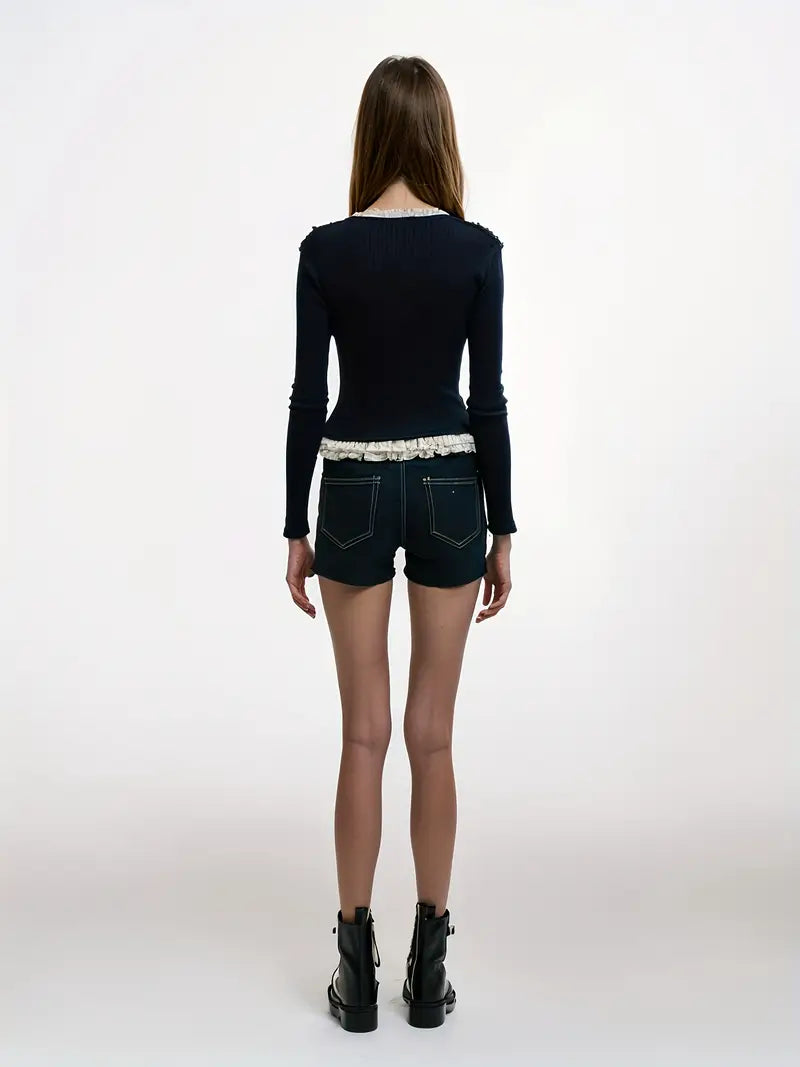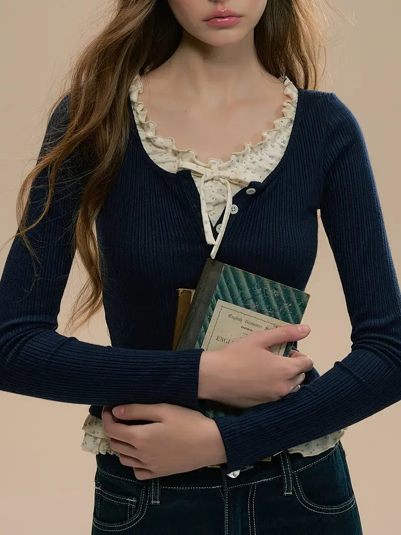 Women's Elegant Japanese-Korean Inspired Mock Two-Piece Color-Block Sweater with Bow Detail & Contrast Collar - Slim Fit Navy Blue & White Ruffle Sleeve Top for Spring/Summer Casual to Formal Wear