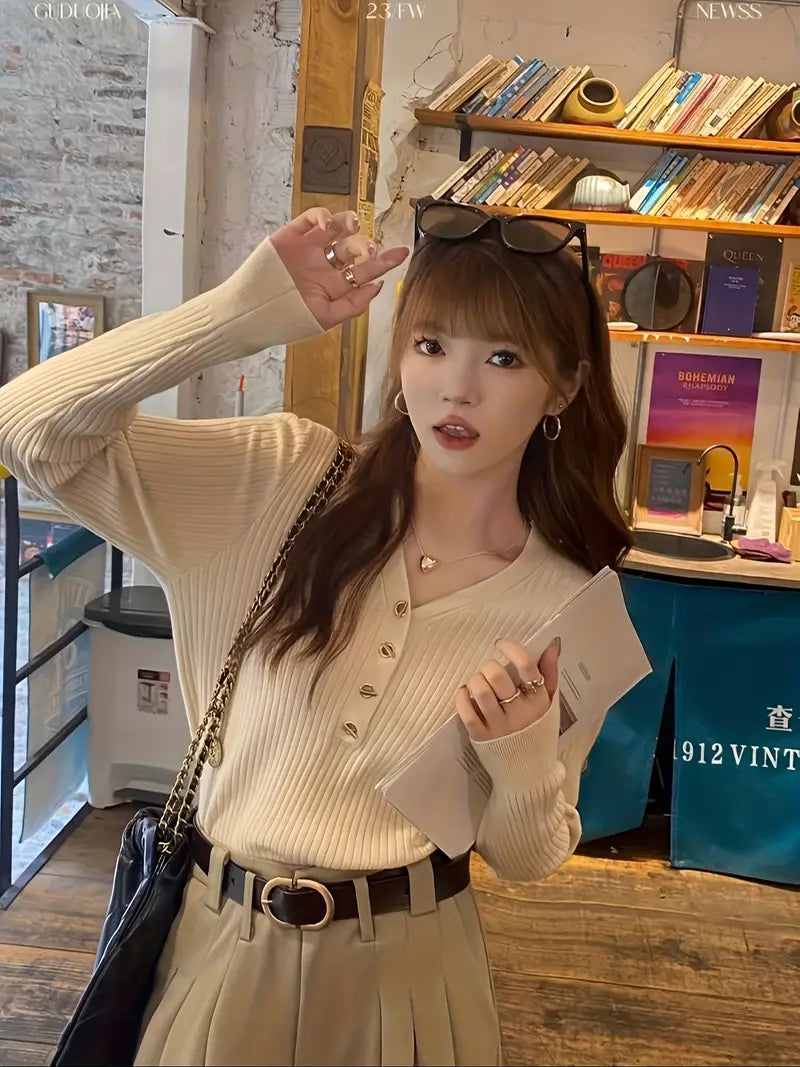 Women'S Soft Sweater - Elegant V-Neck Long Sleeve Blouse, Chic Office & Party Tops, Fall/Winter Layering Essential in Beige/Neutral Tones